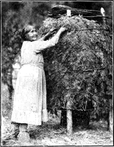 The chuck-ahs in the Museum Garden "Indian Village" constructed by Maggie (Tra-bu-ce) are typical of the granaries employed for staring the acorns. At first glance these huge, cylindrical, basket-like affairs remind one of big, clumsy nests built by some giant bird. Four slender poles of Incense Cedar about eight feet high arranged in a square, and a center log or rock two feet high for the bottom of the chuck-ah, constitute the frame support. The basket-like interior is of interwoven branches of deer brush (Ceanothus) tied at the ends with willow stems and fastened together with wild grapevine. This is lined with dry pine needles and wormwood. The latter supposedly discourages the invasion of insects and rodents and grows abundantly in the museum region. After the chuck-ah has been filled with acorns gathered in the fall, it is topped with pine needles, wormwood, arid sections of Incense Cedar bark that are bound down firmly with grapevines to withstand windstorms. The final touch is thatching the exterior with short boughs of White Fir or Incense Cedar, with needles pointing downward to shed snow and rain, and fastening them securely bands of wild grapevine.