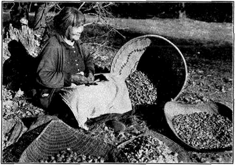 Yosemite Nature Notes: Yosemite Indians; Yesterday and Today (1941) by Elizabeth H. GodfreyFOODAlthough the Yosemite Indians had neither knowledge of cultivation nor a market place to buy provisions, the food supply furnished by native plants, animals. Birds, and insects afforded them a varied diet. For meat they killed the deer, small mammals, birds, end caught fish. In addition, there were acorns, berries, pine nuts, edible plants, bulbs, mushrooms, fungi, larvae of ants and other insects in their season. The acorns of the Black Oak, rich in nutritious vitamins constituted the "staff of life.’' Gathering the acorns, storing them in the chunk-ah granary, along with the complicated preparation of acorn mush and bread constituted a laborious and lengthy task that the Indian women accepted as a matter of routine.